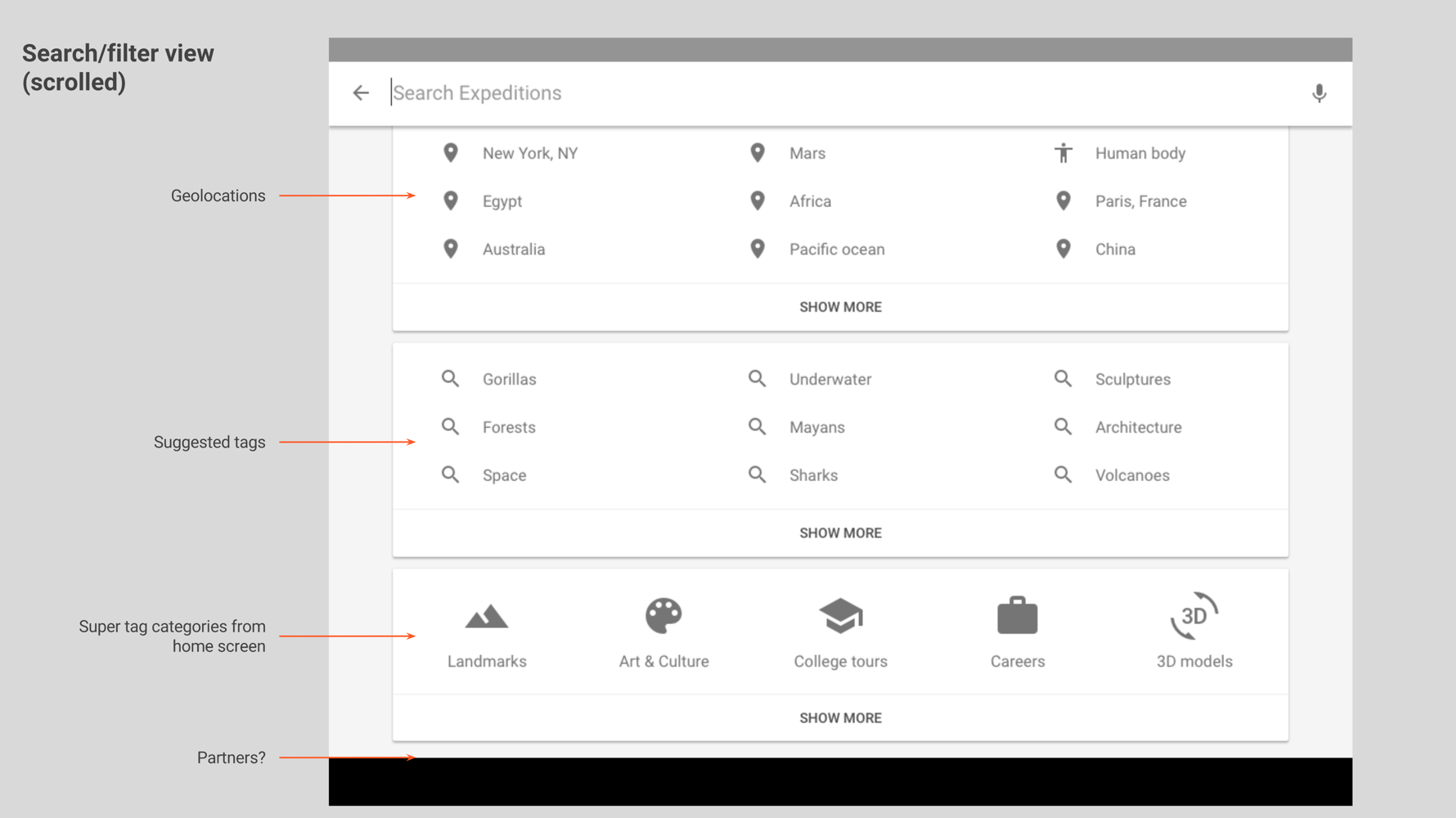 Google Expeditions initially launched with a limited set of virtual field trips that could easily be browsed in a flat list. As the number of field trips grew to hundreds there became a need for improved search/filtering functionalities as well as a scalable organization system. The ability to promote specific field trips was also desired.